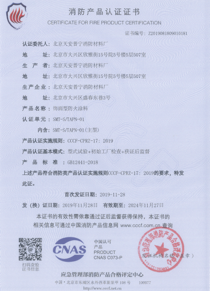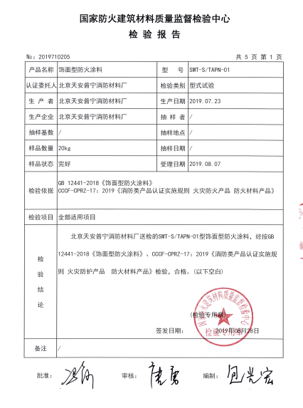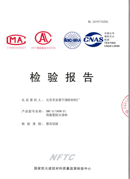 TAPN-01飾面型防火涂料經(jīng)《國家固定滅火系統(tǒng)和耐火構(gòu)件質(zhì)量監(jiān)督檢驗中心》按GB12441-2018《飾面型防火涂料通用技術(shù)條件》標準檢驗,理化性能合格,防火性能一級;TAPN-01飾面型防火涂料集防火性與裝飾性為一體,當涂層遇火時迅速發(fā)泡膨脹,涂層會形成海綿狀較厚實的防火隔熱層,從而達到保護基體防火作用,平常又具有良好的裝飾效果。