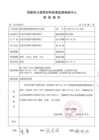 GT-NSP-TAPN 室內(nèi)膨脹型鋼結(jié)構(gòu)防火涂料經(jīng)《國家固定滅火系統(tǒng)和耐火構(gòu)件質(zhì)量監(jiān)督檢驗(yàn)中心》按GB14907-2018《鋼結(jié)構(gòu)防火涂料通用技術(shù)條件》標(biāo)準(zhǔn)檢驗(yàn),理化性能合格,耐火極限最高可達(dá)2h。該涂料具有附著力強(qiáng),耐久性長,涂層薄、耐火極限高、易施工等優(yōu)點(diǎn)。涂層遇火迅速膨脹,涂層形成海綿狀較厚實(shí)的防火隔熱層,使鋼結(jié)構(gòu)遇到火災(zāi)時(shí)不易變彎曲和坍塌,延長鋼結(jié)構(gòu)耐火時(shí)間達(dá)到防火效果。 產(chǎn)品組成: 應(yīng)用范圍:可適用于建筑工程中各種鋼構(gòu)件、球形網(wǎng)架等承重結(jié)構(gòu)的防火保護(hù) 施工工藝: 鋼結(jié)構(gòu)表面應(yīng)徹底除銹,涂刷防銹漆兩遍,表面清潔無油污;